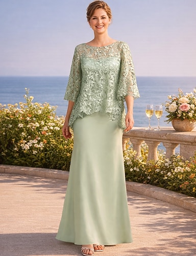 Due Pezzi Tubino Colonna Lunghezza al ginocchio Abito da invitata a nozze Abito da cerimonia per signora Manica 3/4 Collo gioiello Elegante Formale Ospite di nozze Chiesa Chiffon Pizzo Con Stola