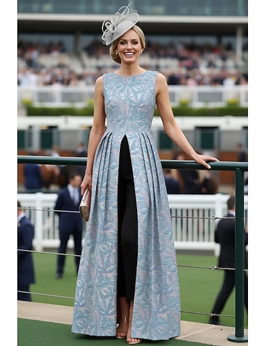 Linea ad A Lunghezza al pavimento Abito da invitata a nozze Abito Derby Abito da cerimonia per signora Senza Maniche Girocollo Elegante Derby del Kentucky Raso Misto Lino-Cotone con Stampa floreale