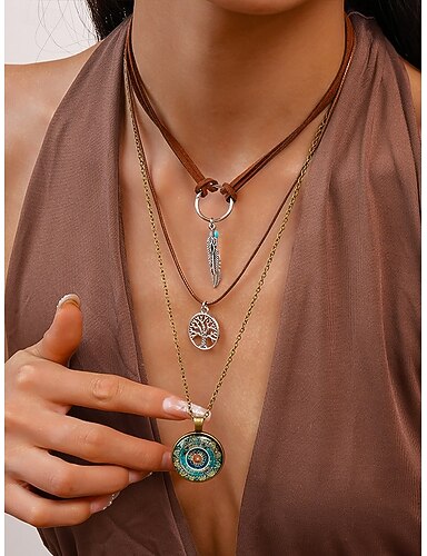 collana con ciondolo a strati in stile bohémien da donna, gioielli a tre fili con piuma, albero della vita e ciondolo rotondo vintage per festival, feste e abbigliamento casual