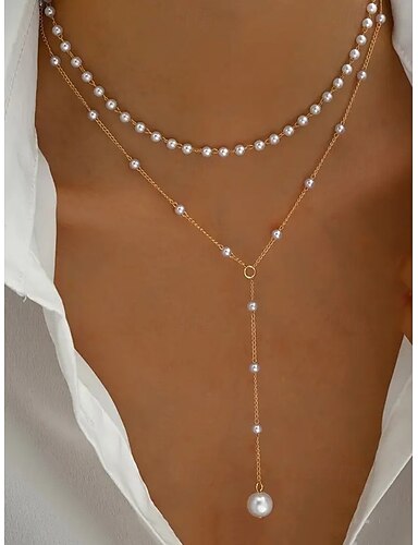 collana con ciondolo a strati di perle da donna: elegante catena in lega color oro con dettagli in perle finte per eventi formali, matrimoni e feste serali
