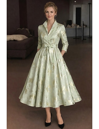 Linea ad A Lunghezza Tè Abito Camicia Abito Formale Abito da sera Abito da cerimonia per signora Manica 3/4 Colletto a Camicia Elegante Vintage Formale Jacquard con Fascia / Nastro Fiocco/Fiocchi