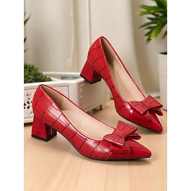 décolleté da donna con tacco a blocco in similpelle verniciata rossa – tacchi a spillo con fiocco e motivo a griglia per ufficio, feste e occasioni eleganti