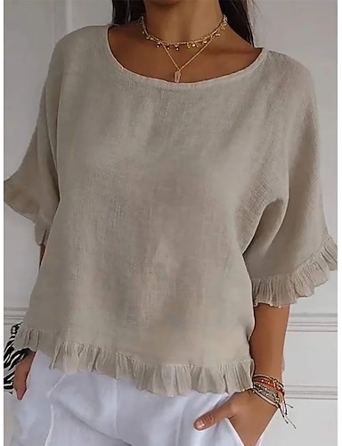 Per donna Blusa Finto cotone e lino Arricciato Volant Semplice Elegante Vintage Casual Mezza Manica Girocollo Top Regolari Quotidiano Ferie Uscire Blu Verde Albicocca Estate Primavera