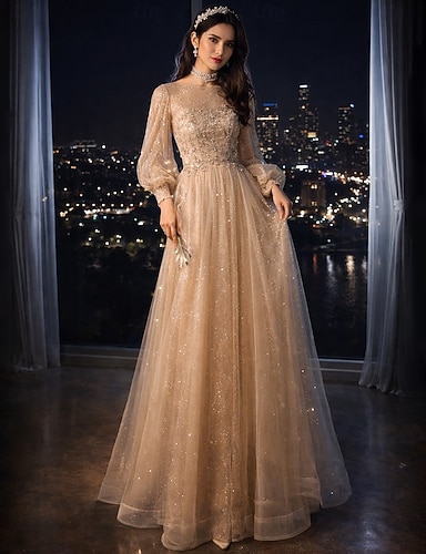 Linea ad A Lunghezza al pavimento Abiti da Ballo Carino Fiabesco Manica Lunga Collo gioiello Balli di fine anno Ospite di nozze Tulle con Paillettes Applicazioni