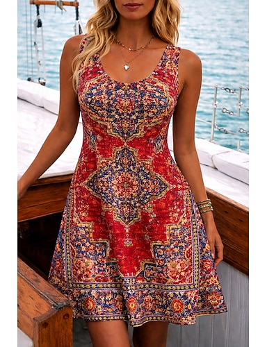 Per donna Mini Abito Abito a trapezio Abito Estivo Abito a spalle scoperte Vacanza Casual Spiaggia Spiaggia Ferie Vestibilità regolare Grafico Tribale Senza Maniche Collo a U Rosso scuro Rosso