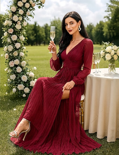 Abito lungo A-Line formale abito da sera per la madre della sposa con maniche lunghe scollo a V elegante vintage da festa con pieghe spacco davanti