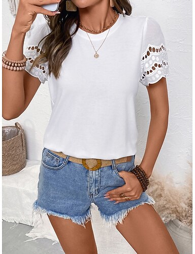 Top Eleganti in Pizzo Bianco per Donna con Occhielli Maglietta Casual di Colore Solido Regolare Maniche Corte Collo a V Pizzo Patchwork Bottoni Regolare Fit Giornaliero Romantico Petite Top Estivi da