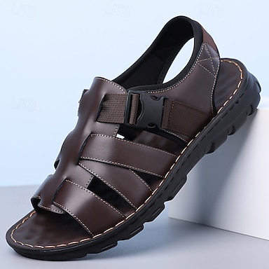 Sandali da pescatore da uomo in pelle marrone, a punta chiusa e aperti, scarpe casual da passeggio con fibbia regolabile, ideali per l'uso quotidiano, i viaggi, il tempo libero all'aperto, le vacanze estive e un comfort smart casual.