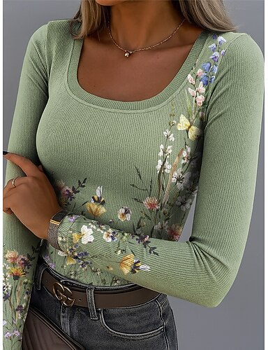 Maglietta da donna a maniche lunghe a costine grafica floreale elegante vintage regolare stampa quotidiana rosa blu viola verde grigio primavera autunno
