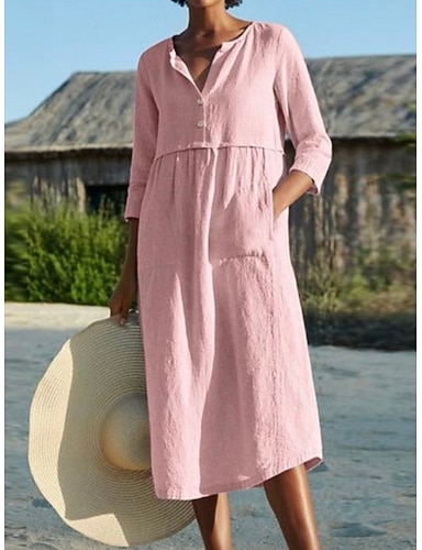abito midi da donna in finto cotone e lino, abito a tubino casual da giorno, vestibilità ampia, tinta unita, maniche a 3/4, scollo rotondo, blu, nero, rosa, vino, estate, primavera, autunno
