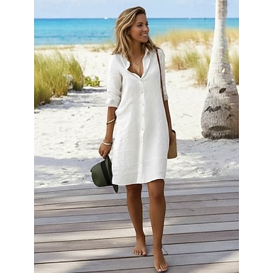 Per donna Mini Abito Finto cotone e lino Abito Camicia Abito Bianco Copricostume Hawaiano Spiaggia Vacanza Ferie Vestibilità comoda Manica Lunga Colletto a Camicia Nero Bianco Estate