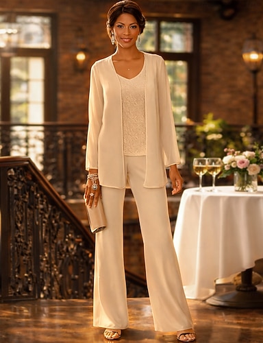 Tuta Completo Pantalone Tre Pezzi Lunghezza al pavimento Abito da cerimonia per signora Manica Lunga Scollo a V Elegante Formale Ospite di nozze Chiffon Pizzo Abiti con Giacca con Applicazioni