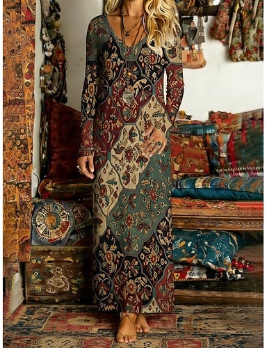 Per donna Abito Lungo Maxi Abito Abito Boho Abito Vintage Vestito Casual Vintage Quotidiano All'aperto Vacanza Vestibilità regolare Floreale Manica Lunga Scollo a V Verde Primavera Autunno