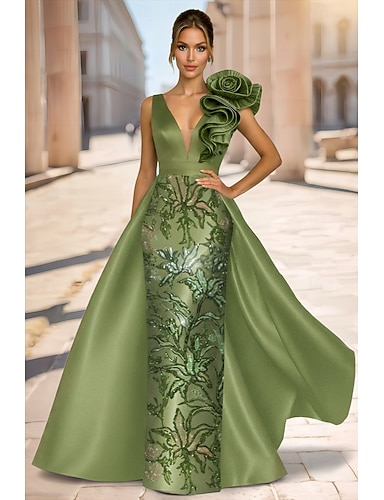 Tubino Colonna Lunghezza al pavimento Perline ricamate Abito Formale Abito da madre della sposa Abiti da Cocktail Abito da ballo con sopragonna Elegante Scintillante Floreale Senza Maniche Scollo a V