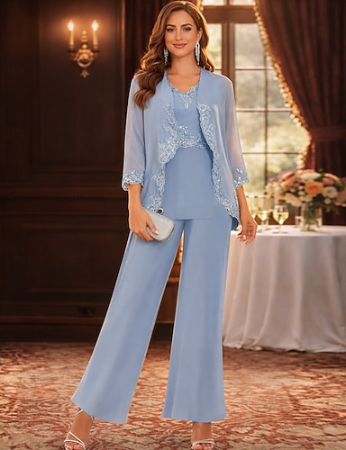 Completo pantaloni Abito per la madre della sposa di lunghezza fino al pavimento a maniche lunghe scollatura quadrata elegante invitata al matrimonio in pizzo con tinta unita