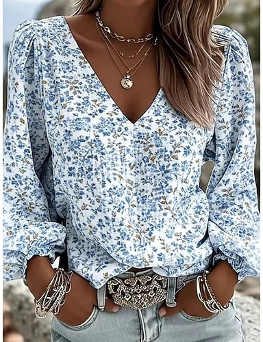 Per donna Camicia Camicia Boho Floreale Grafico Elegante Bohemien Vacanza Manica Lunga Scollo a V Top Regolari Quotidiano Ferie Uscire Viola chiaro Viola Azzurro Estate Primavera