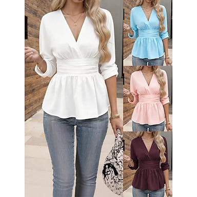 camicetta da donna in raso, arricciata, tinta unita, elegante, basic, casual, manica lunga, scollo a V, normale, top, quotidiano, blu, bianco, rosa, fucsia, primavera, autunno