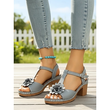 sandali da donna con tacco a blocco, dettagli floreali grigi e cinturino alla caviglia - scarpe casual e comode per l'uso quotidiano, viaggi, appuntamenti &eventi all'aperto