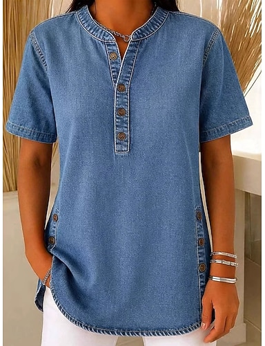 Per donna Camicia Blusa Bottoni Semplice Elegante Classico Moderno Manica Corta Scollo a V Top Regolari Quotidiano Ferie Uscire Blu Azzurro Estate Primavera