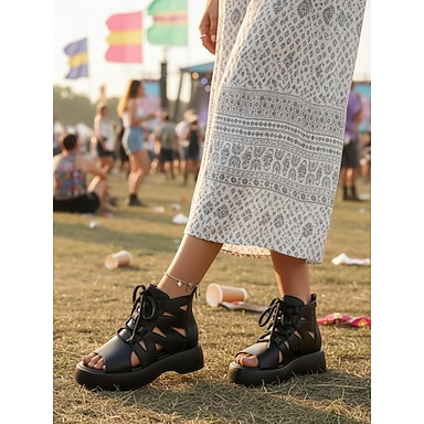 sandali gladiatore da donna con plateau e lacci neri - stile stivaletto con suola spessa, punta aperta e intaglio, calzature alla moda e all'avanguardia per concerti, festival e street style