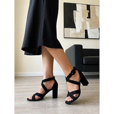 sandali eleganti da donna in pelle scamosciata nera con tacco a blocco - comode scarpe eleganti con cinturino e punta aperta &cinturino alla caviglia per lavoro, abbigliamento da ufficio &eventi