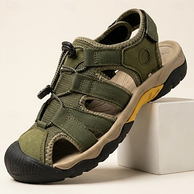 Sandali sportivi da uomo color oliva, aperti in punta, regolabili, scarpe da passeggio leggere e comode per l'estate, ideali per viaggi, escursioni, vacanze al mare e attività all'aperto.