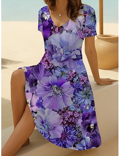 Per donna Mini Abito Vestito T-Shirt Vestito Estivo Abito a trapezio Vacanza Casual Boho Spiaggia Uscire Vestibilità regolare Floreale Grafico Manica Corta Scollo a V Viola Estate Primavera