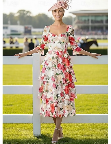Linea ad A Lunghezza Tè Abito a Strati Abiti da Cocktail Elegante Floreale Manica 3/4 Scollo a Cuore Festa in giardino Matrimonio Pizzo con Stampa floreale Ricamo
