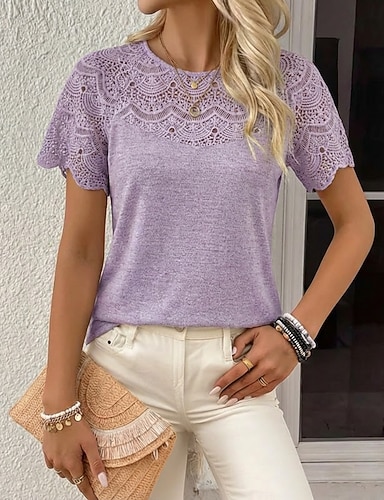 Per donna Top in pizzo Giogo in pizzo Elegante Casual Manica Corta Girocollo Top Regolari Quotidiano Nero Bianco Viola Estate Primavera