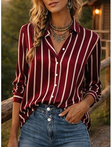 Per donna Camicia Camicia in raso Stampato A righe Vacanza Moda Quotidiano Manica Lunga Colletto a Camicia Top Regolari Quotidiano Ferie Uscire Blu Vino Estate Primavera Autunno