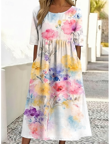 Per donna Abito Midi Vestito Casual Abito Stampato Moda All'aperto Vacanza Uscire Vestibilità regolare Floreale Grafico Mezza Manica Girocollo Bianco Estate Primavera
