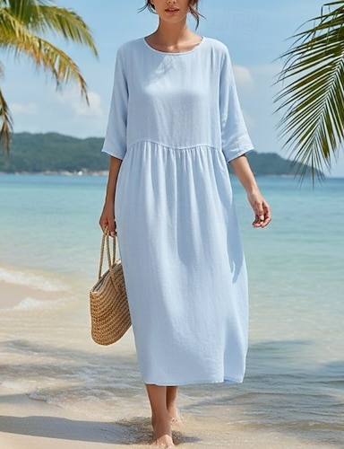Per donna Abito Midi 100% cotone Abito a Tubino Vestito a caftano Vestito Casual Moda Essenziale Classico Quotidiano Spiaggia Weekend Vestibilità regolare Semplice Mezza Manica Girocollo Bianco Rosa