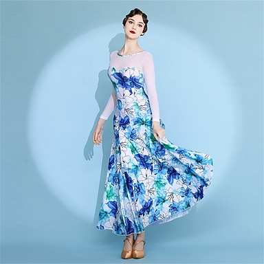 abito da ballo da sala con stampa floreale per donna - abito a trapezio a maniche lunghe con maniche trasparenti per competizioni, latino e eventi di danza - blu& bianco