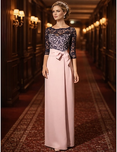 Tubino Colonna Lunghezza al pavimento Abito da invitata a nozze Abito Formale Abito da sera Abito da cerimonia per signora Manica 3/4 Collo gioiello Elegante Ospite di nozze Raso Pizzo con