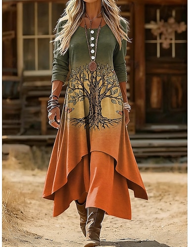 Abito Maxi Donna Vintage Bohemien A Line Abito Collo a Barca Maniche Lunghe Casual Giornaliero Vestibilità Regolare Grafica Geometrica Blu Arancione Verde Blu Scuro Primavera Autunno Inverno