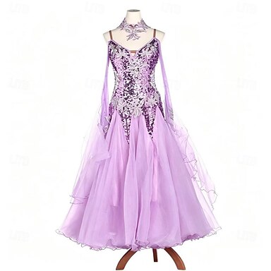 Abito da ballo liscio americano da donna, lilla, con applicazioni floreali di strass e maniche a sbuffo, perfetto per le competizioni.