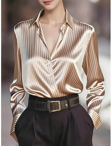 Per donna Camicia Elegant Elegante Top in raso Bottoni Tinta unica Vintage Tropicale Elegante Manica Lunga Scollo a V Colletto a Camicia Top Regolari Quotidiano Uscire Nero Cammello Marrone Grigio