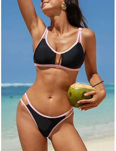 Costume da bagno da donna Bikini 2 pezzi Colore a blocchi Tanga Slim Senza schienale Abbigliamento da spiaggia Vacanza Grafica Geometrica Collo all’americana Senza maniche
