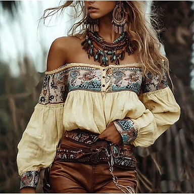 Per donna camicetta western Camicia Boho Blusa Stampato Fiore Moderno Boho Manica Lunga Senza Spalle Top Regolari Quotidiano Uscire Albicocca Estate