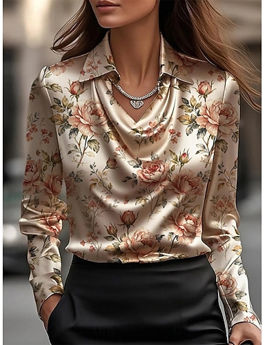 Per donna Camicia Elegant Top in raso A calotta di seta Stampato Drappeggiato Floreale Grafico Elegante Casual Manica Lunga Scollo a Cascata Top Regolari Quotidiano Lavoro Ferie Blu Nero Rosa Rosso