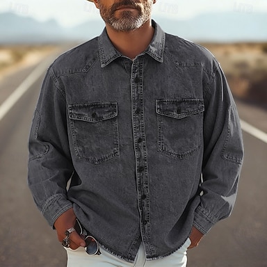 Per uomo Camicia Camicia di jeans Maglietta informale Nero Blu Azzurro Manica lunga Liscio Bavero Strada Da mare Tasche Abbigliamento Di tendenza Comodo Hawaiano