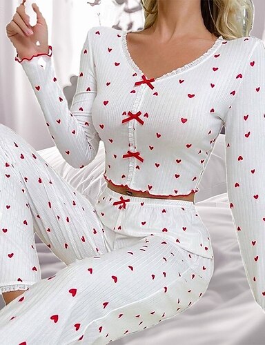 Per donna Set Pigiama Casual Comfort Cuore Elastico in vita Pantalone Quotidiano Casa Manica Lunga Scollo a V Blu Nero Rosa Rosso Estate Primavera Autunno Vestibilità aderente