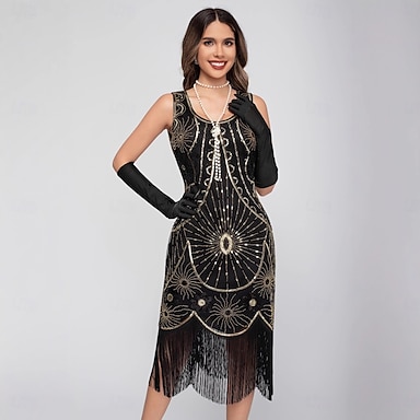 Anni Ruggenti Anni 1920 Lunghezza al ginocchio Abito Flapper Senza maniche Il grande Gatsby Paillettes Frange Scollo Tondo Costume Per donna Natale Carnevale speakeasy Mascherata Festa a tema retrò