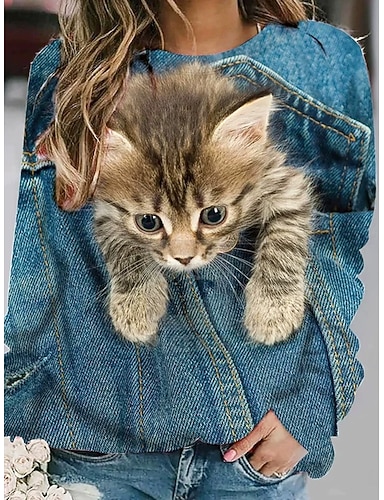 Per donna Felpa Pullover Felpe con cappuccio Stampato Grafico Animale Gatto Moda Casual Manica Lunga Girocollo Top Regolari Streetwear Abbigliamento Quotidiano Blu denim Primavera Autunno Inverno