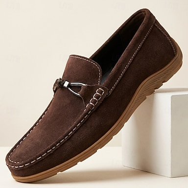 Mocassini da uomo in pelle scamosciata marrone, scarpe casual slip-on, calzature morbide e comode, ideali per l'uso quotidiano, la guida, i viaggi, l'ufficio, gli outfit del fine settimana e uno stile casual elegante e rilassato.