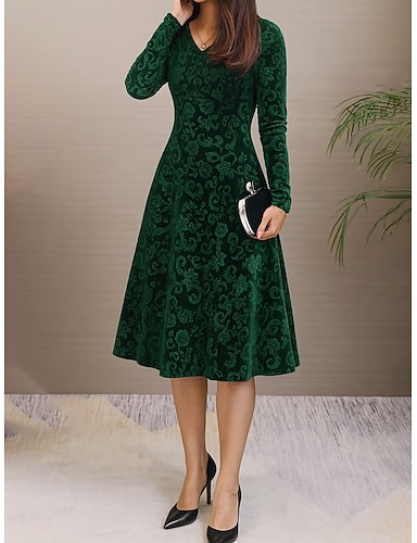 Abito Maxi in Velluto da Donna Vestito a Campana Vestito Casual Quotidiano Festività Uscite Fit Regolare Maniche Lunghe Collo a V Stampato Nero Vino Blu Viola Primavera Autunno Inverno