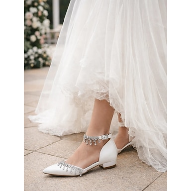 scarpe da sposa con tacco a spillo in raso bianco con cinturino alla caviglia e cristalli per la sposa