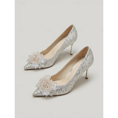 Décolleté da sposa da donna color argento glitterato, tacco a spillo a punta con applicazioni floreali per matrimonio e cerimonia &ricevimento