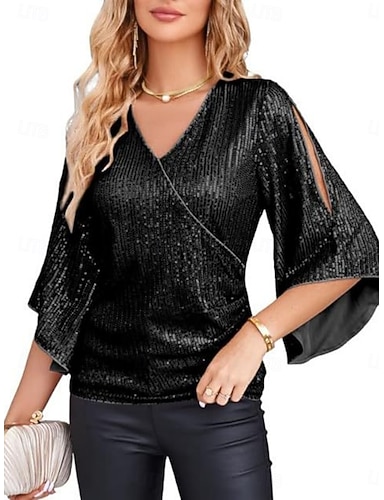Per donna Blusa Paillettes Tinta unica Elegante Moderno Manica 3/4 Scollo a V Top Regolari Quotidiano Nero Fucsia Primavera Autunno Inverno