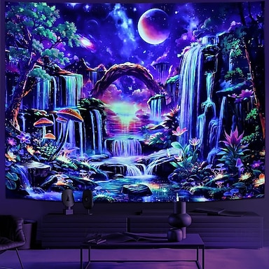 arazzo di montagna con luce nera, arazzo floreale con piante psichedeliche, arazzo da parete con pianeti galattici reattivi ai raggi UV, arazzo paesaggistico con cascate al neon, arazzo da parete per